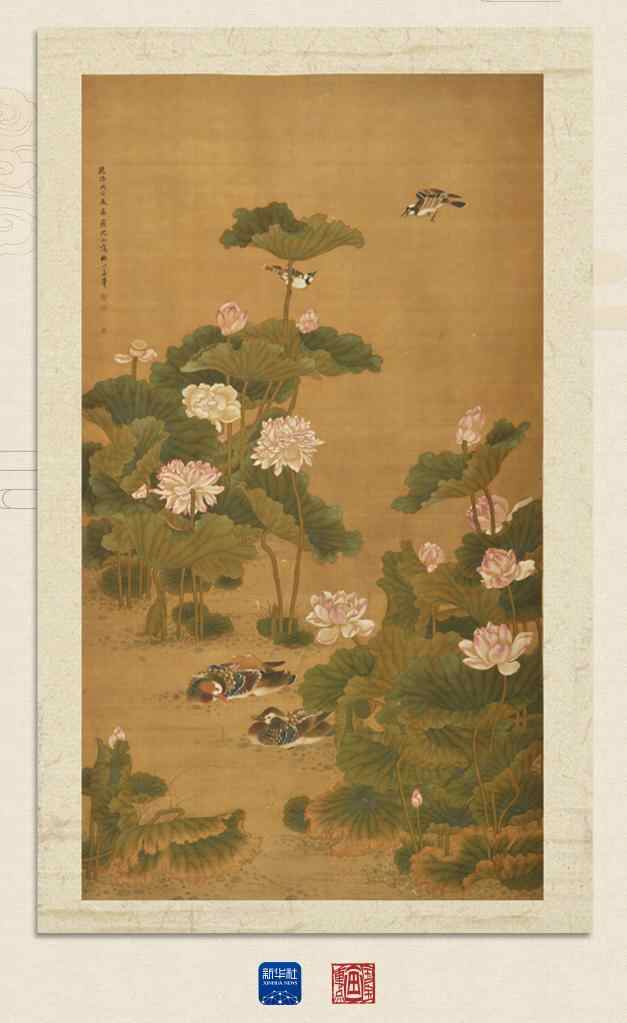 这幅《荷花鸳鸯图》是清代花鸟画巨匠沈铨76岁时所画。沈铨擅画走兽花鸟,已臻于出神入化的地步。此图画面紧凑,富于变化。笔致工谨细腻,造型准确生动,敷彩浓艳雅致,烘染过渡自然。于工整细丽的院体花鸟中,融入了文人审美的自然情趣。