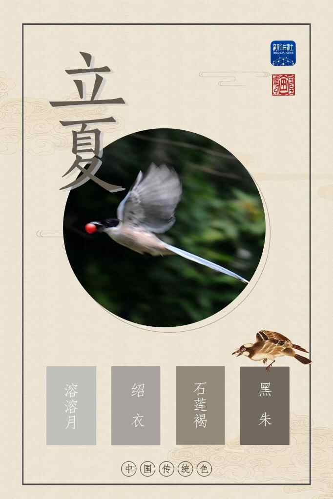 我们用溶溶月、绍衣、石莲褐、黑朱这四种颜色,来展现立夏的轻盈。空中喜鹊栖翔飞落,互为唱和。就像这只喜鹊一样,夏,轻盈而至。