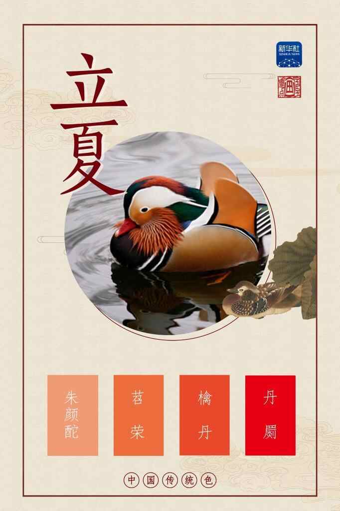 我们用朱颜酡、苕荣、檎丹、丹罽这四种颜色,来展现立夏的活力。水中鸳鸯成双,在花间叶下相携徜徉。