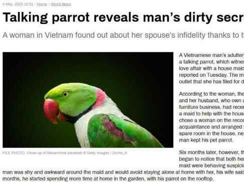 据“今日俄罗斯”(RT)5月4日报道,近日,越南一户人家的宠物鹦鹉因为帮助女主人找到丈夫出轨的证据,而登上热搜。越南当地媒体报道称,这位女主人在接受采访时表示,她已提出离婚申请。
