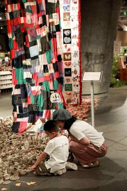 本次展览从桂南学校“自然美育”的特色理念出发,由孩子们亲手制作展品、布置会场。呆萌可爱的主题装置霸王龙、天然去雕饰的陶艺泥塑、不拘一格宛如波洛克艺术的挂毯、童趣率性的剪纸作品……桂南学校学子们注入了丰富的想象力,将树枝、石头、棉线、纽扣等自然与生活中常见的物品转化为创作素材,并在敲打、粘磨、缝补的过程中不断提高动手能力。