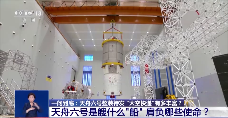 航天科技集团五院天舟货运飞船系统总体主管设计师 董圣然:运送的主要是包括航天员驻留的一些生活物资,主要包括他们的食品、衣服、节日用品以及一些卫生用品等,还有给航天员在天上做实验的一些实验设备。