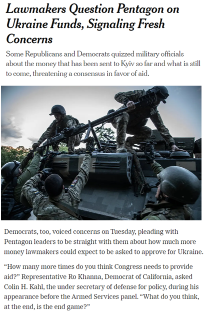 《纽约时报》:加州民主党籍联邦众议员罗·康纳曾质问美国国防部副部长科林·卡尔:“你认为国会还需要提供多少次援助?你认为最终的结局是什么?”