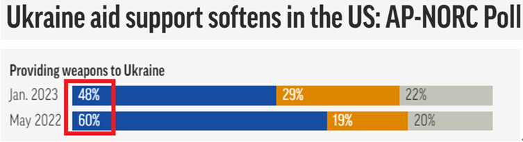 美联社公共事务研究中心的民调显示,美国大众对军援乌克兰的支持率已从去年5月的60%掉到今年1月的48%。