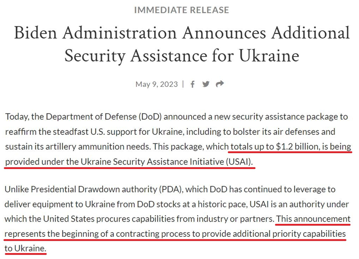 美国国防部官网:“最新援助声明代表了向乌克兰提供额外优先能力的军工采购合同程序的开始。”