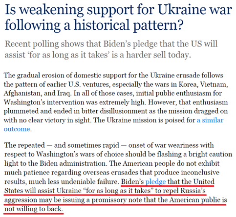 而它们反映出的共同模式就是:美国人对政府的支持度最终都一落千丈,“这应该给拜登政府敲响警钟”。可如今拜登却承诺将“尽可能长时间”地帮助乌克兰获胜,“这可能是一张美国公众不愿支持的期票”。