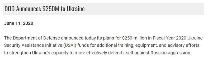 美国驻乌克兰大使馆官网:USAI于2020年6月11日开始实施,旨在通过军援、培训、咨询等手段进一步“加强乌克兰更有效抵御俄罗斯的能力”。就在USAI计划实施当天,美国国防部就宣布在2020财年的USAI项目中拨款2.5亿美元给乌克兰。