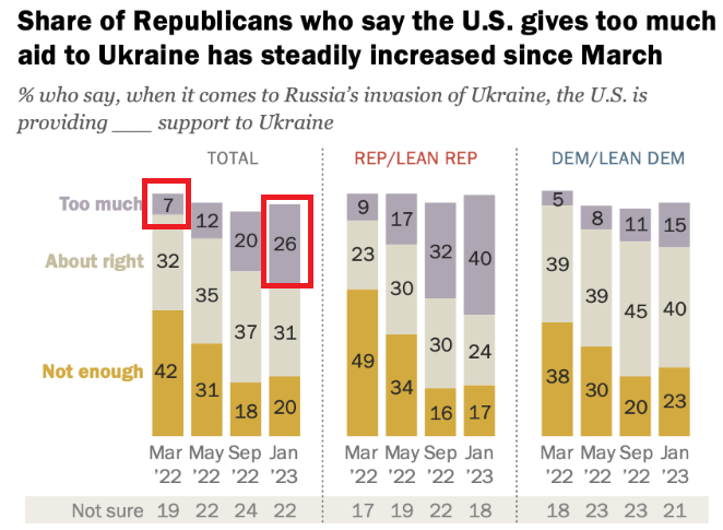 皮尤研究中心的民调显示,认为美国对乌克兰“付出太多”的美国人比例已从一年前的7%上升到26%。