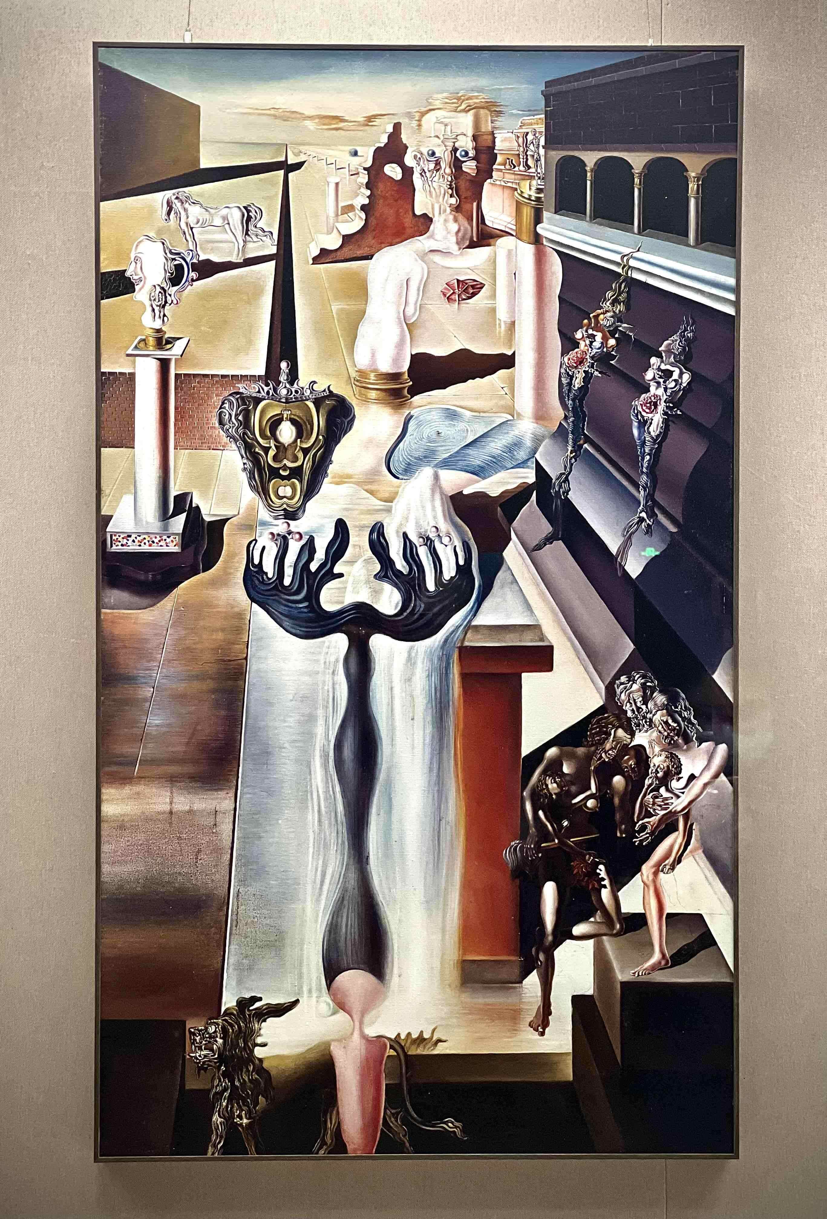 这些作品的风格丰富多变,几乎贯穿了达利整个创作生涯,反映了达利受到印象主义、立体主义、超现实主义等风格影响,逐渐形成强烈个人风格的过程。作品呈现了达利在不同阶段的风格演变和创新探索,既包括他在青少年时期模仿意大利文艺复兴三杰之一——拉斐尔而创作的《拉斐尔式脖颈的自画像》(约1921年),也包括他在超现实主义阶段早期运用“双重图像”手法创作的第一批画作之一《隐形人》(1929-1932年),以及他在热衷科学和原子理论的“核神秘时代”时期创作的《卡拉巴思迪亚,天体构成的加勒提阿》(1952年)等代表作。展览还展出了达利生前创作的最后一幅油画《无题.燕尾与大提琴.突变系列》(约1983年),体现了画家晚期极为抽象化、意象化的艺术风格。
