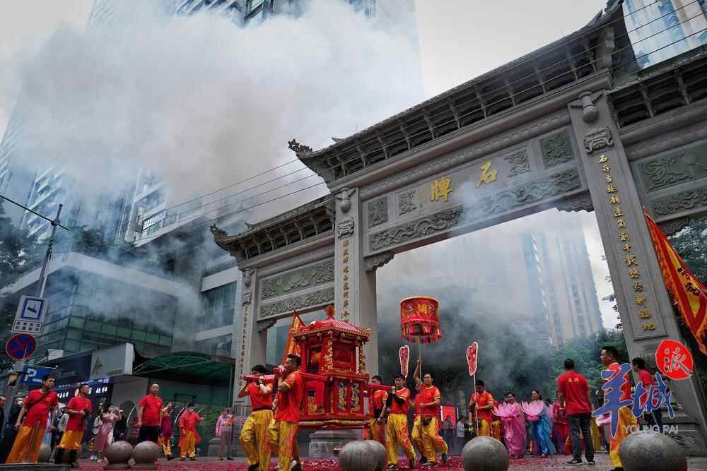 5月12日正诞日上午8点,妈祖巡游祈福正式开始。巡游队伍从石牌村朝阳东大街的“娘妈厅”出发,穿街过巷来到珠江新城石牌安居房二三期牌坊广场,—石一路上狮舞助兴,鼓乐齐鸣,场面热闹喜庆。