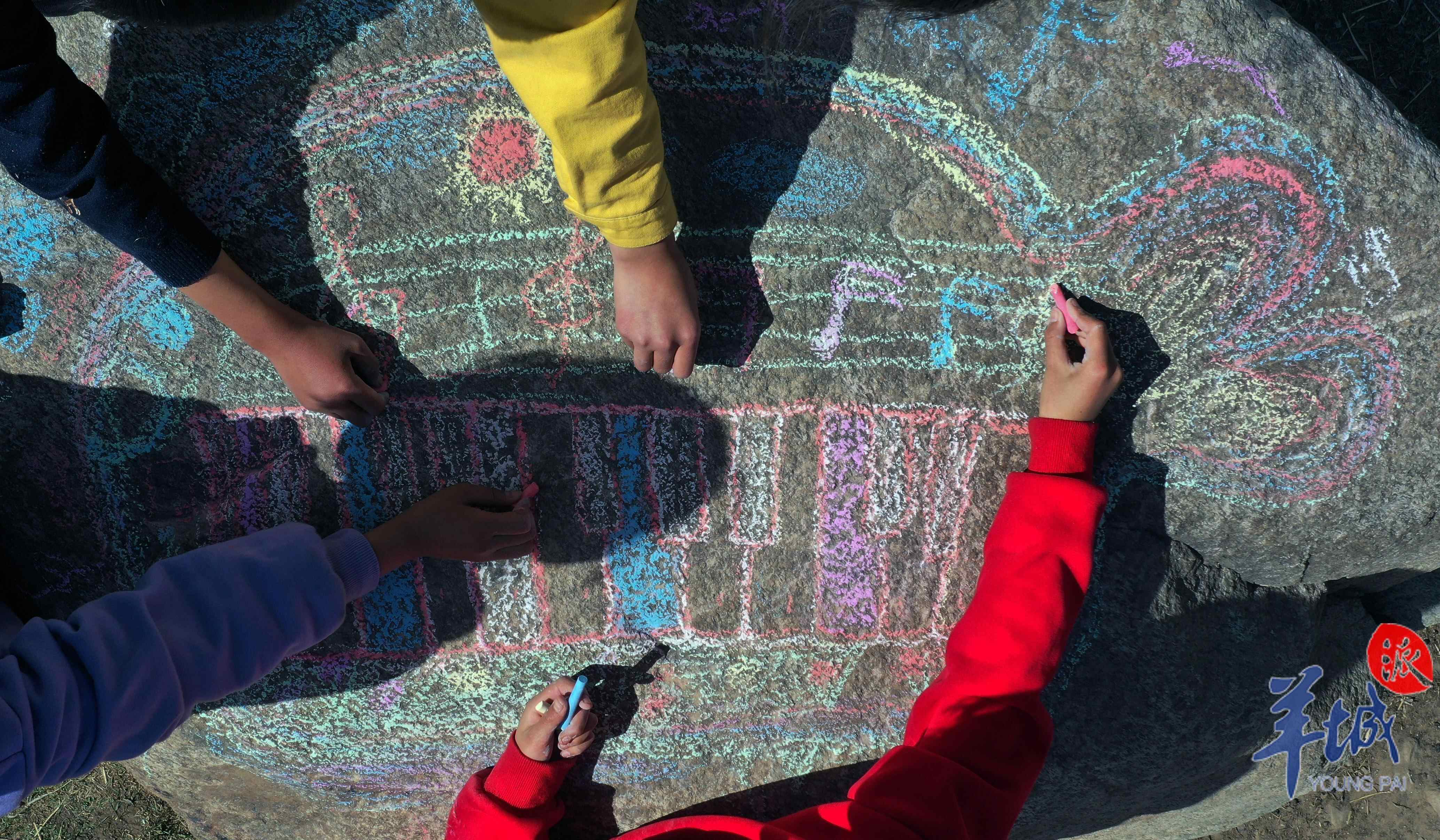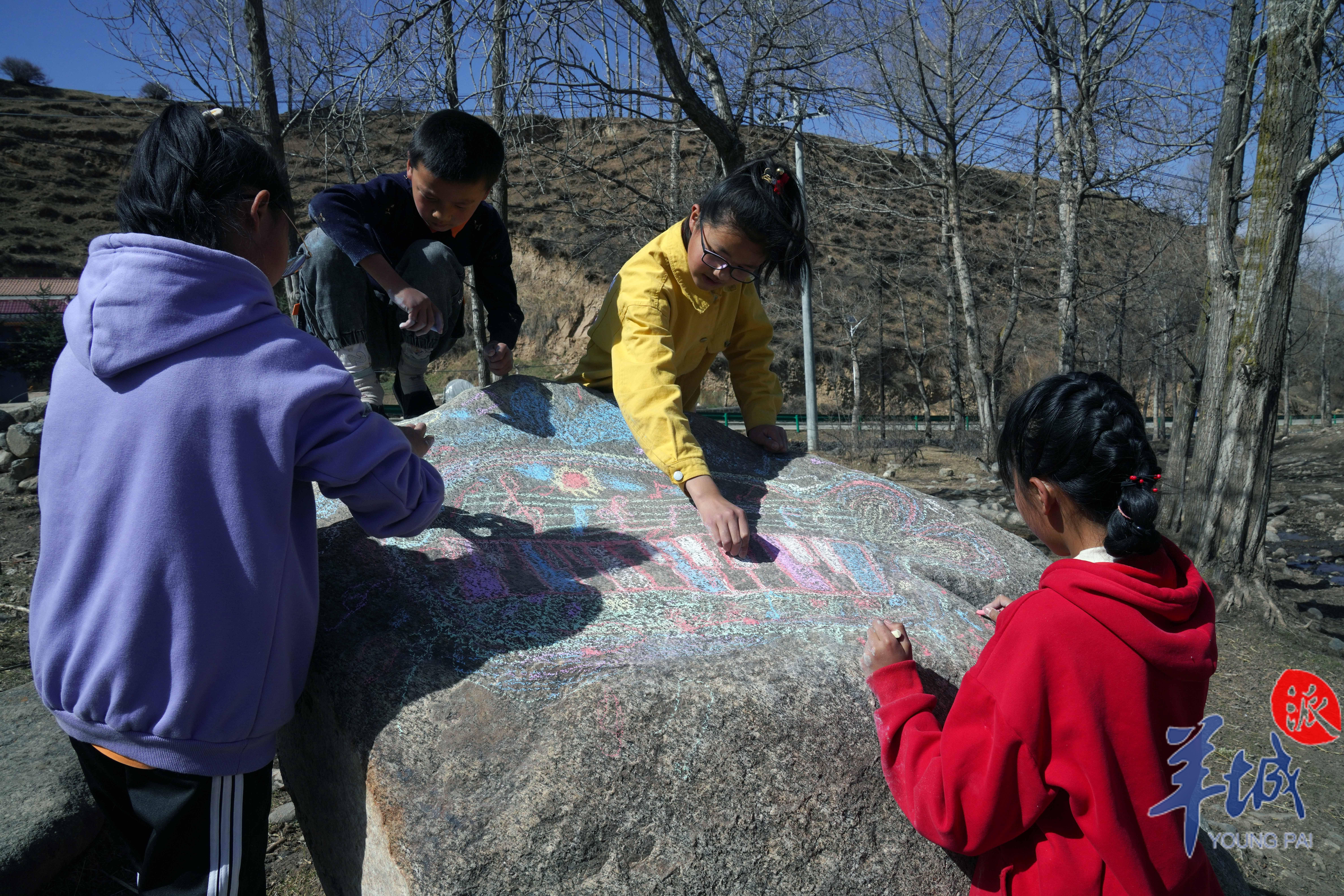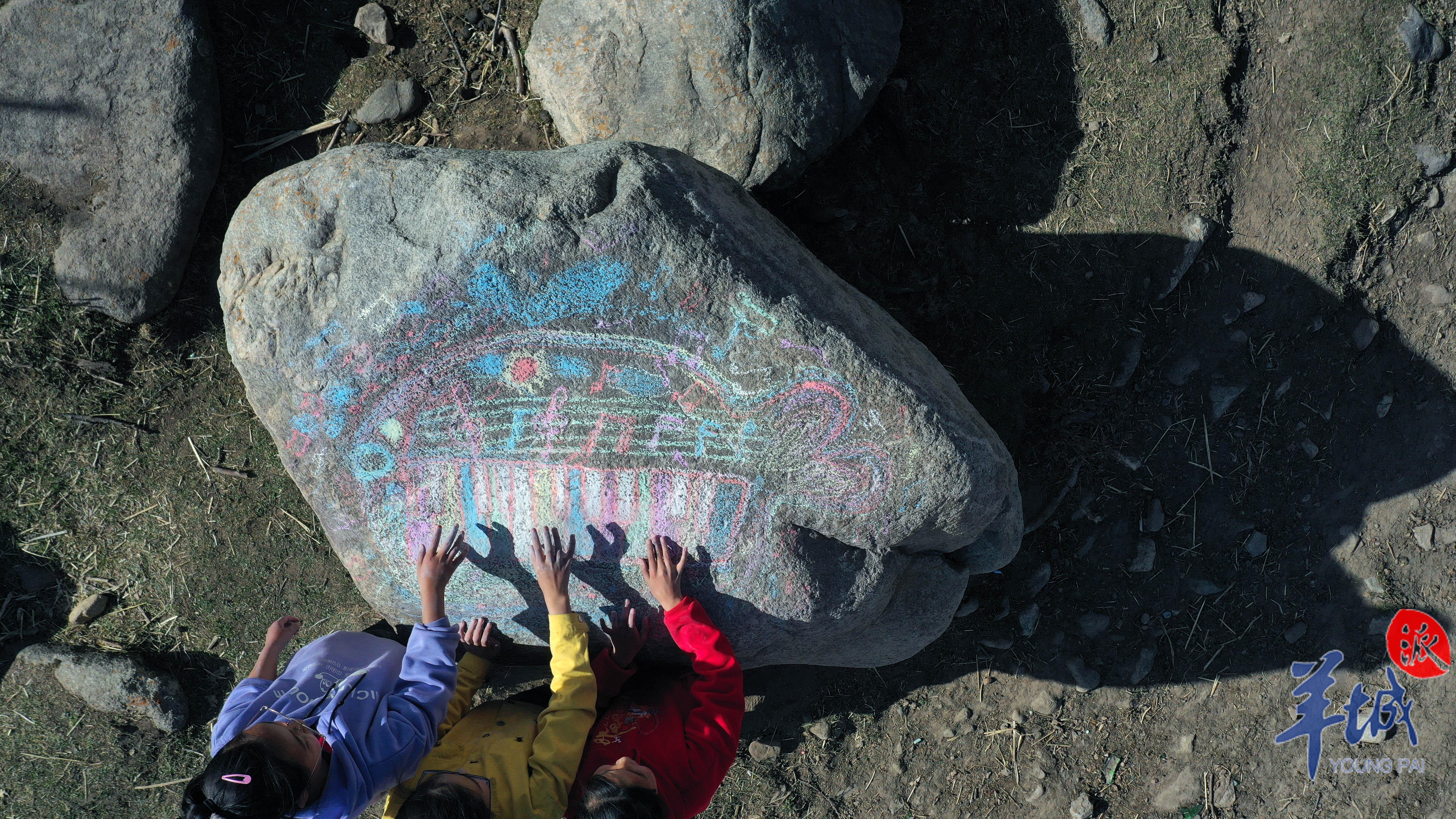 13岁的小建玲家门口就有大石头,她与几个小伙伴在一块大石头上画钢琴。