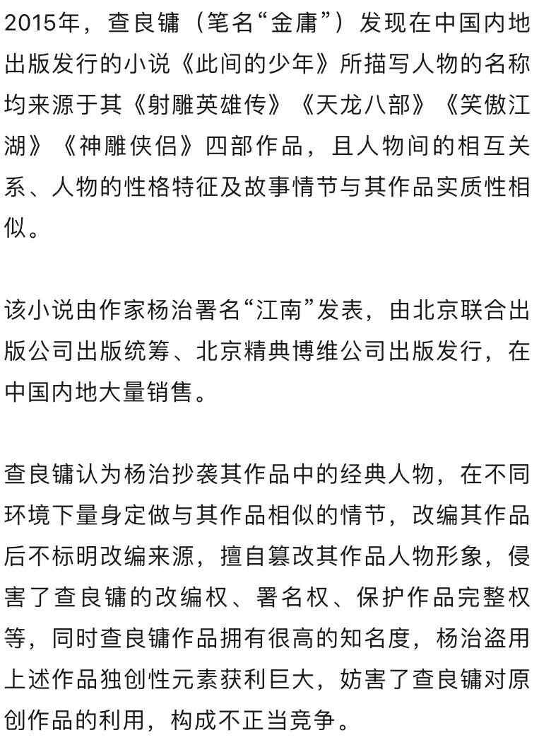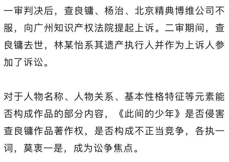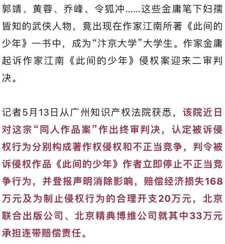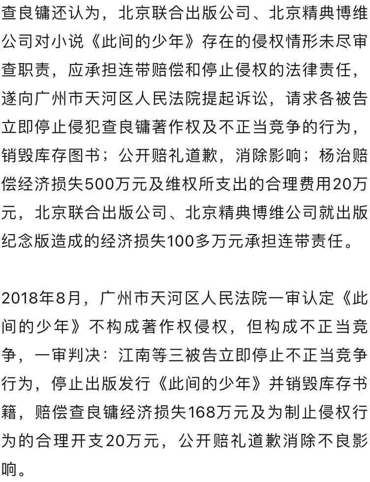 《此间的少年》多数人物名称、主要人物性格、人物关系与查良镛涉案小说有诸多相似之处,存在抄袭剽窃行为,侵害了涉案作品著作权,依法应承担相应的民事责任。北京联合出版公司、北京精典博维公司对其出版发行的作品是否侵权负有较高的注意义务,收到《律师函》后未及时停止出版、发行,构成帮助侵权。