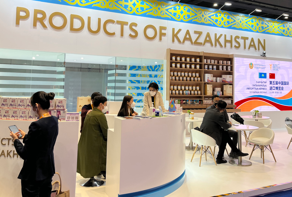 这是2022年11月6日在第五届进博会上拍摄的哈萨克斯坦产品展区。 新华社记者 郑冬睿 摄