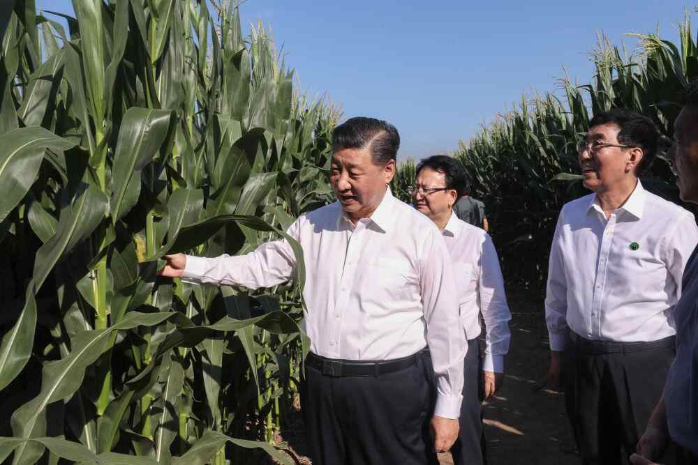 2020年7月22日,在吉林四平市梨树县国家百万亩绿色食品原料(玉米)标准化生产基地核心示范区地块,习近平走进玉米地,察看玉米长势。