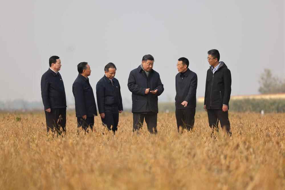 2021年10月21日,习近平在山东东营市黄河三角洲农业高新技术产业示范区考察时,走进田间察看大豆长势。