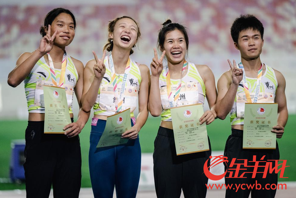 女子4x100米接力颁奖典礼上 广东队选手拉牵手上台