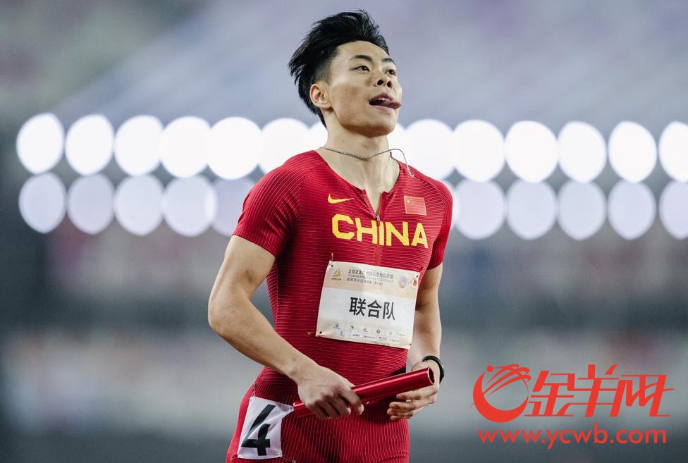 男子4x100接力赛中 联合队陈冠锋率先冲过终点