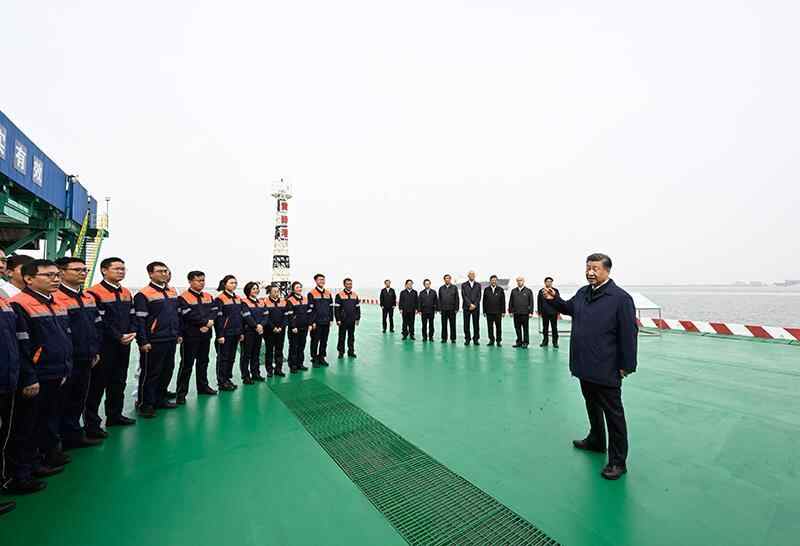 △2023年5月11日,习近平总书记在河北沧州市黄骅港煤炭港区码头考察时,同码头工作人员、船务人员亲切交流。