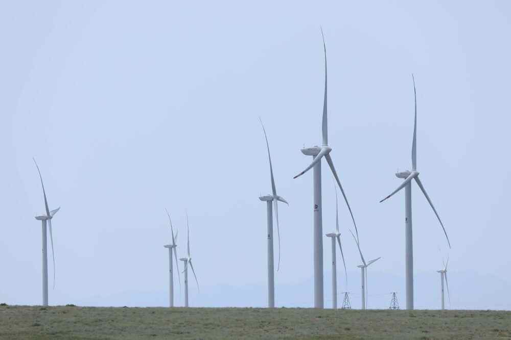 图为2021年5月24日在哈萨克斯坦扎纳塔斯拍摄的风电场的风机。新华社发(奥斯潘诺夫摄)