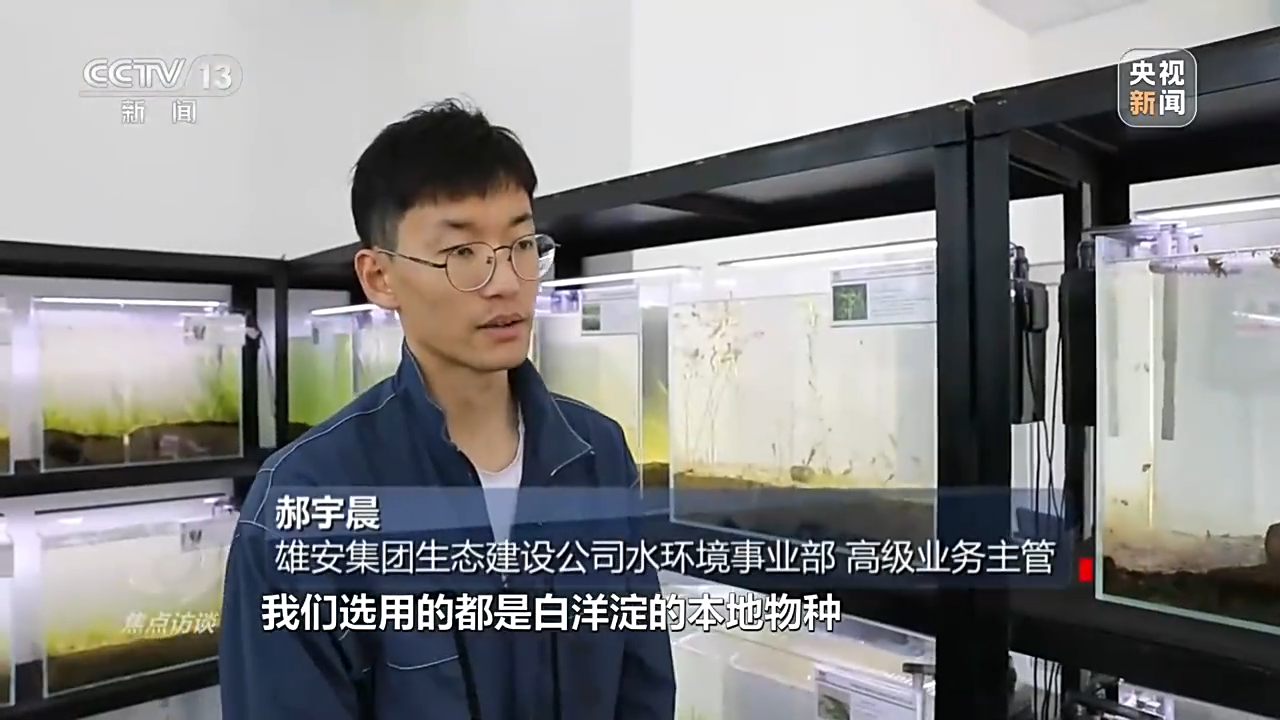 雄安集团生态建设公司水环境事业部高级业务主管 郝宇晨:我们选用的都是白洋淀的本地物种,眼子菜和菹草对水中的氮磷具有非常好的处理效果,动物可以通过进食在水中繁衍。另外,为动物产卵提供非常好的场所。矮生耐寒苦草冬季常绿,通过搭配和组合,能够最大化提高或者保证对入淀水质的净化效果。