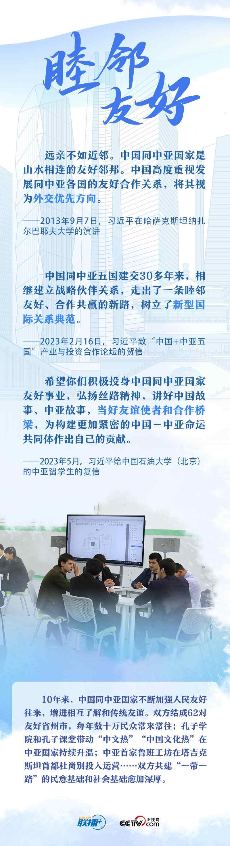 习主席把中国同中亚五国合作的成功密码总结为“相互尊重、睦邻友好、同舟共济、互利共赢”。他强调,这四项原则是在合作中积累的宝贵经验和共同财富,是中国同中亚国家关系行稳致远的政治保障,也是中国同中亚国家友好交往继往开来的力量源泉。央视网《联播+》与您一起学习。
