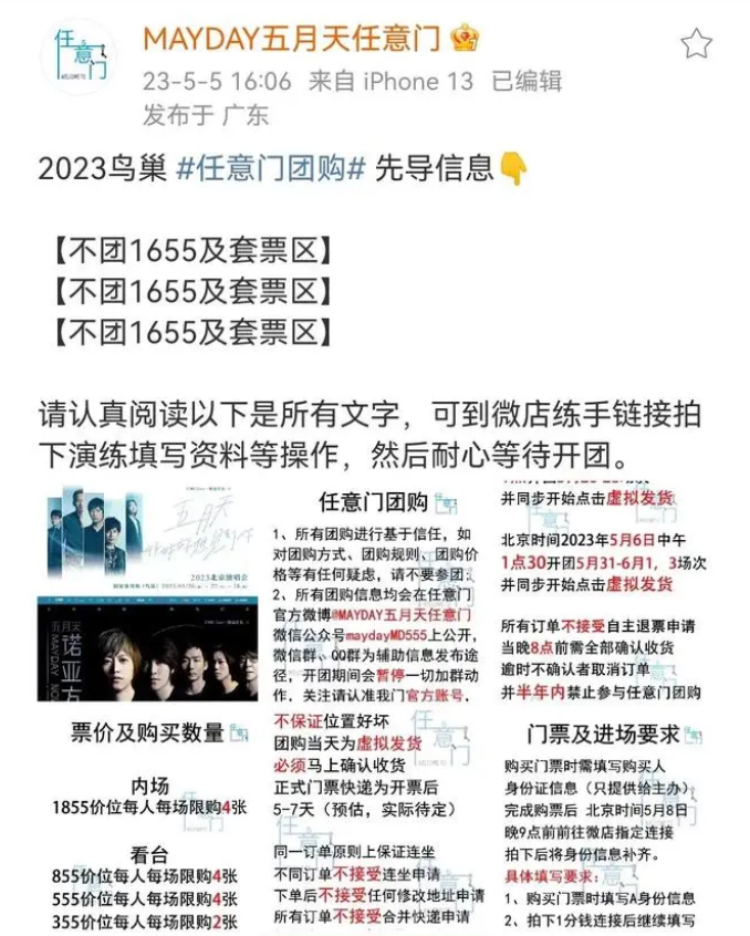 原因无他,自5月6日以来,粉丝们便已打起了“门票保卫战”,“五迷抵制黄牛”相关话题更是引爆了舆论场。而“黄牛”之所以成为今年粉丝的重点拔除对象,导火索是五月天演唱会北京场次门票的粉丝团票被迫取消。