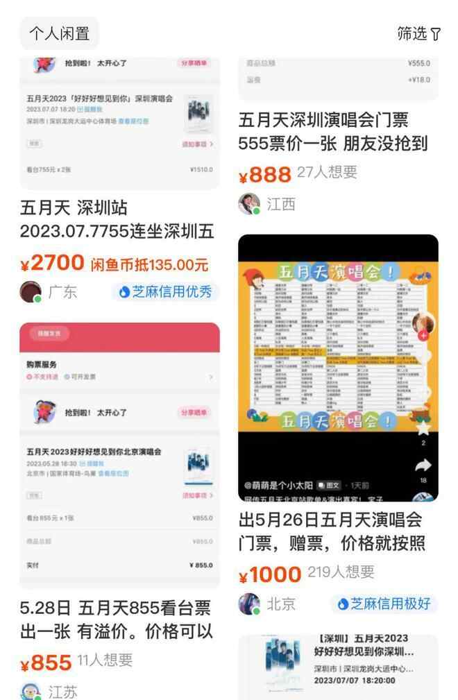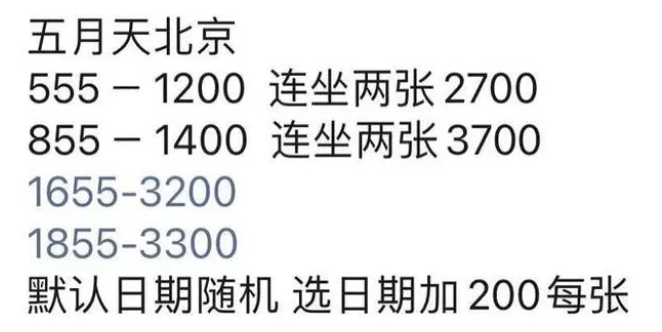 与此同时,5月9日开票当天,“黄牛”曾报价18800元的五月天演唱会第一排门票,仅一周后已下跌至10800元,直降8000元;而1855元这一档位不可任选座位的门票,另有大批“黄牛”如今报价3000元左右。