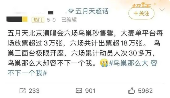 5月9日,五月天鸟巢演唱会门票在票务平台开票,仅5秒,6场演唱会近30万张门票全部售罄,这一售罄速度简直令人瞠目结舌。一名抢票失败的粉丝在社交平台感慨:“鸟巢那么大,却容不下一个我。”
