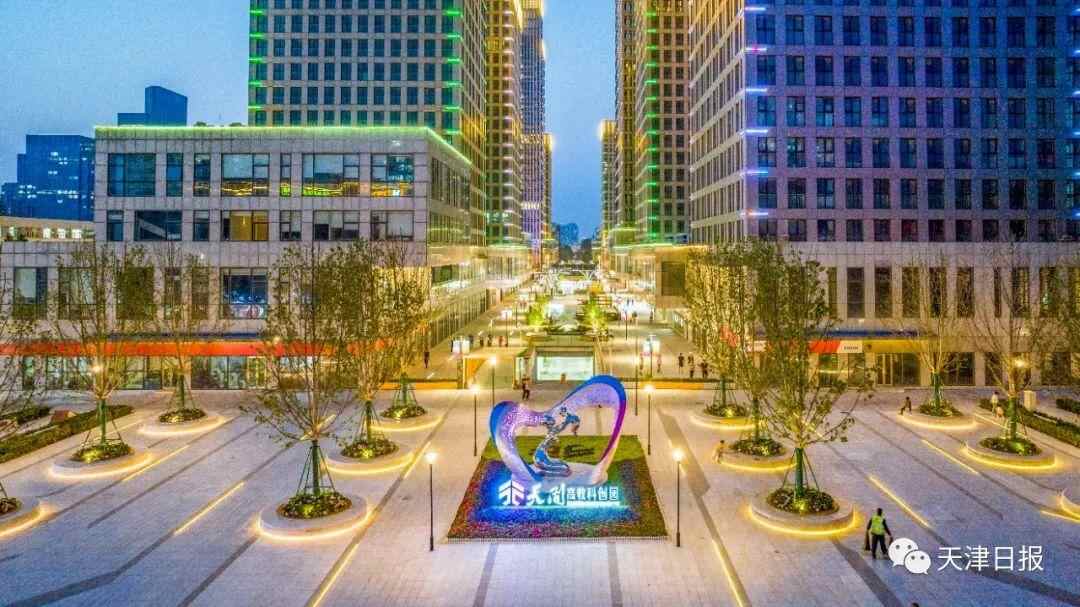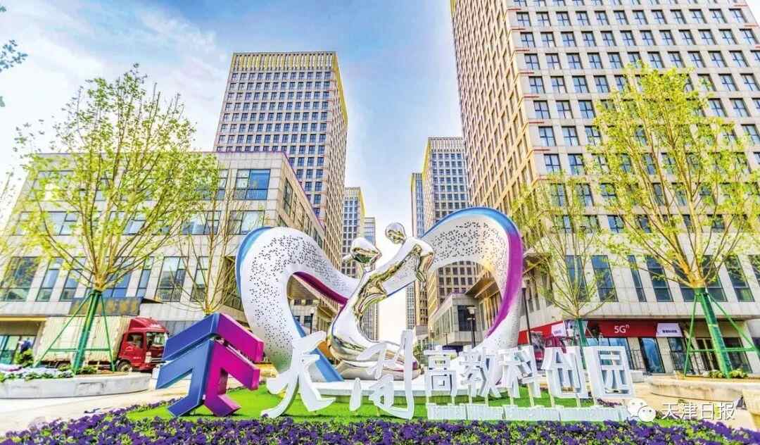 5月14日,天开高教科创园主雕塑在核心先导区──天津科技广场南广场树立完成,莫比乌斯环围合“母育子”的形象寓意“天开”的未来拥有无限可能。