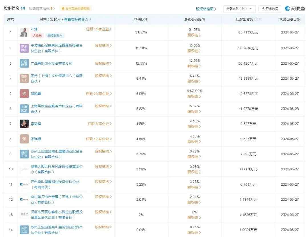 天眼查网站显示,目前,笑果文化共有14个股东,包括:叶烽(持股比例31.57%)、宁波梅山保税港区泽禧股权投资合伙企业(有限合伙)(持股比例13.58%)、广西腾讯创业投资有限公司(持股比例12.55%)等。此外,李瑞超(李诞)持股4.58%,李诞还曾在笑果文化担任高管。