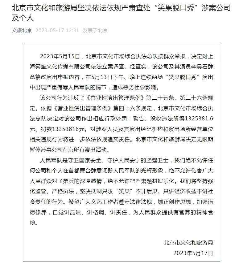 5月17日,笑果文化在北京、上海等地被要求演出暂停,罚款金额超一千万元。中演协要求会员单位对笑果文化演员李昊石进行从业抵制,北京警方已对其立案调查。