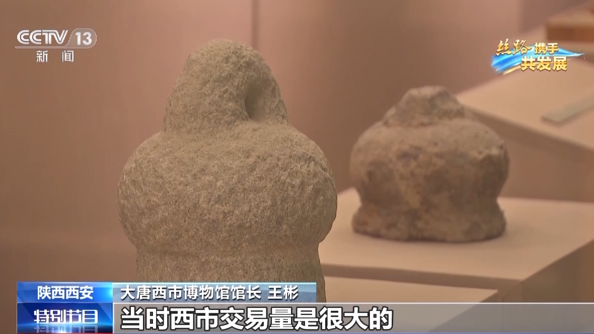 大唐西市博物馆馆长 王彬:它是石权,是我们西市出土的,用我们通俗的话说是秤砣。有这么大的石权,它称重的物品,肯定重量也是很大的,通过这个石权我们也可以了解到当时西市交易量是很大的。