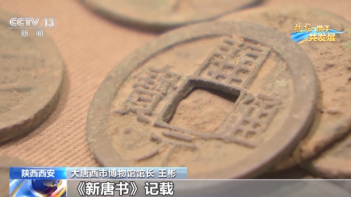大唐西市博物馆馆长 王彬:《新唐书》记载,贞观十年的时候,两万五千枚开元通宝,可以换一匹马,然后这些商人可以拿这些开元通宝,可以去购买其他的物品带回西域。