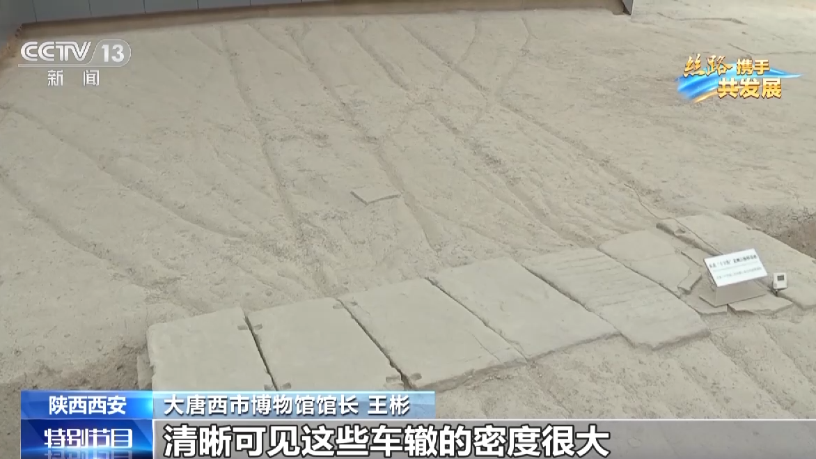 大唐西市博物馆馆长 王彬:这是唐代留下(西市)东北十字街的遗址,路宽16米,相当于我们现在的双向4车道的马路,清晰可见的这些车辙的密度很大,说明车流量很大,所以,现在我们通过这个车辙遗迹,可以折射出唐代,大唐西市国际贸易中心这种物流滚滚,车流滚滚的繁荣盛景。