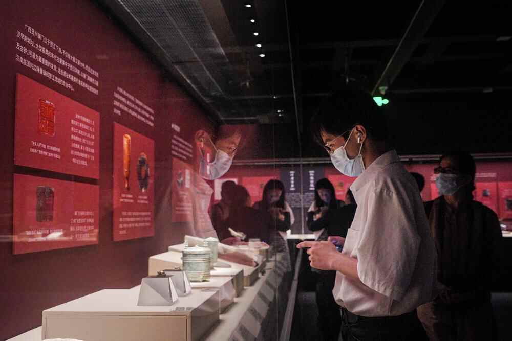 记者在展览现场看到,“赵佗”铜印、“华音宫”铭款器盖残片、银盒、人操蛇铜托座、错金铭文铜虎节等众多精品文物,令观众大开眼界。其中,上海博物馆藏“赵佗”铜印将在本次展览中进行短期展出。