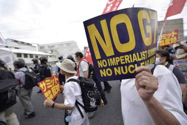 与此同时,在泽连斯基抵达广岛当天,多国抗议者齐聚广岛反对召开G7峰会,现场用多种语言打出“反对七国集团峰会召开”“反对美日韩军事同盟”“美军撤出日本撤出亚洲”的横幅。抗议者谴责七国集团成为美国全球军事战略的工具,威胁地区稳定(上图)。