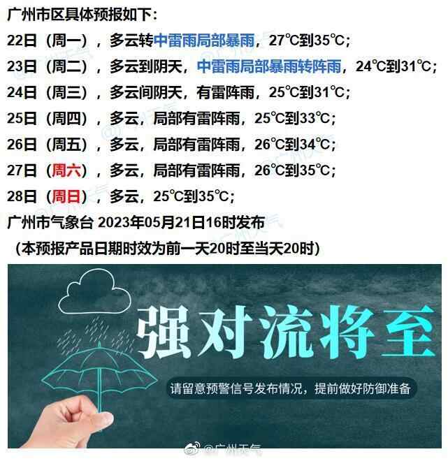 @广州天气 预计,受切变线和冷空气影响,22日午后至23日早晨,广州有一次明显强降水过程,并伴有8-10级短时大风、短时强降水和强雷电等强对流天气;23日白天降水减弱,高温有所缓解。