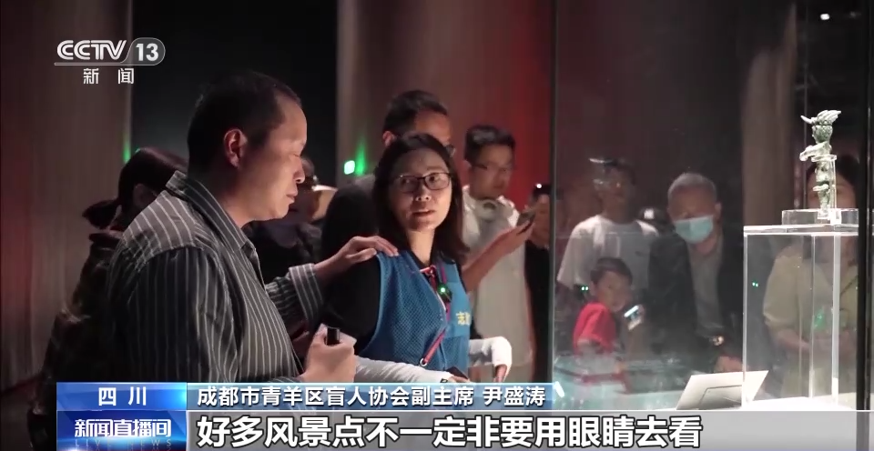 成都市青羊区盲人协会副主席尹盛涛:走在青城山上到处都是树木,深吸一口气,植物的芬芳很舒服的,走在山腰或者到了山顶上,唱一唱山歌,喊一喊,那感觉和家里是不一样的。进了一个博物馆,就像进了历史的长河一样,有种历史的感觉、沧桑的感觉。好多风景点不一定非要用眼睛去看,可以用心灵去感受。