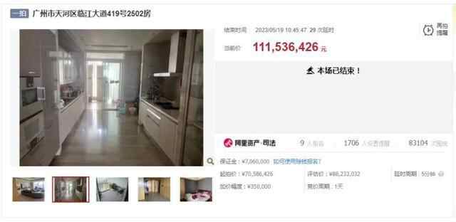 2023年5月18日至19日,广州市天河区人民法院在阿里资产平台上拍卖广州市天河区临江大道419号2502房(住宅),起拍价7058.6426万元,9人报名,经过53次竞价,最终以1.11536426亿元成交。