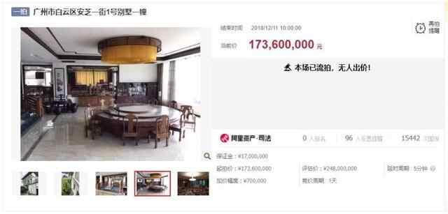 2018年12月10日11日,广东省遂溪县人民法院在阿里司法拍卖平台对广州市白云区安芝一街1号别墅一幢进行公开拍卖,起拍价1.736亿元。