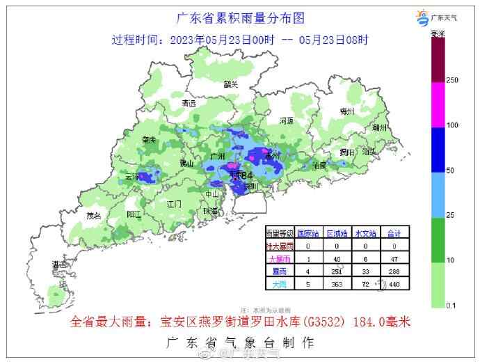据@广东天气消息,今天(5月23日)00时到08时,广州、惠州、东莞、深圳、中山等地雨势猛烈,累计雨量较大的站点有:宝安区燕罗街道罗田水库站184毫米(1小时最大142.2毫米)、东莞大岭山镇181毫米(1小时最大118.9毫米)、广州增城区石滩镇147毫米、惠州惠城区芦洲镇139.5毫米、中山黄圃镇107.8毫米。