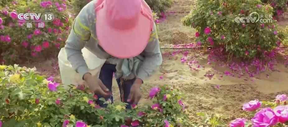 走进新疆和田地区于田县的玫瑰种植示范基地,不同品种的玫瑰花竞相绽放、争奇斗艳,村民们正忙着采摘玫瑰,不一会功夫,框子里已经装满沉甸甸的花朵。