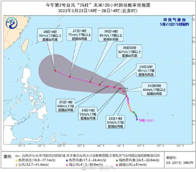 23日14时,台风“玛娃”已经加强为超强台风,中心附近最大风力17级,60米/秒(约216公里/小时),中心气压920hpa。