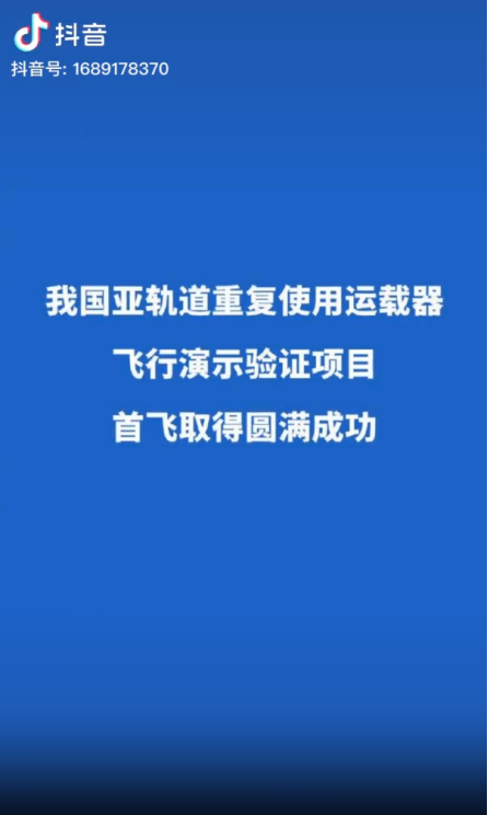 2021年7月,国家国防科技工业局在社交媒体账号“中国军工”上发布了一条仅有文字和背景音乐的视频,内容只有一句“我国亚轨道重复使用运载器飞行演示验证项目首飞取得圆满成功。”