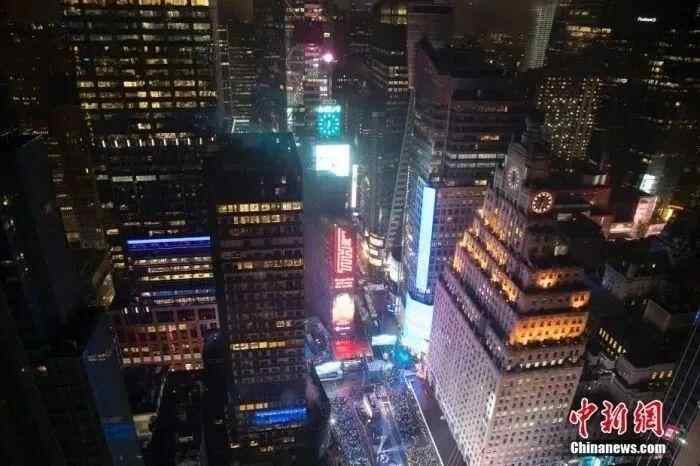 当地时间2022年12月31日,美国纽约市一年一度的时报广场跨年庆祝活动如期举行,约一百万人在雨中热闹迎新年。图为从高楼俯瞰跨年庆典现场。