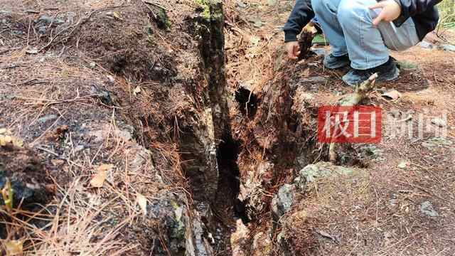记者注意到,这处地缝周边散落着不少石块,地缝边缘一棵手臂粗的小树被砍断,从截面痕迹推断,这棵树应该是近期刚被砍掉。岑超福、罗木辉夫妇和女儿阿桃矗立在地缝旁,令他们难以置信的是,日思夜想的阿成居然会被埋葬于此。