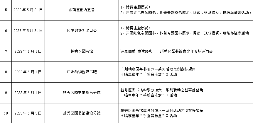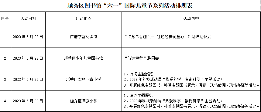 据了解,6月1日,越秀区图书馆还将举行“诗享四季 童读经典”——越秀区图书馆青少年专场诗词会,通过展览、赏析、朗诵、配对游戏等多种形式展示中华诗词经典所蕴含韵律之美和思想精髓。