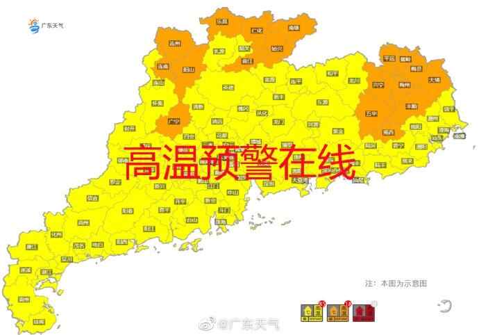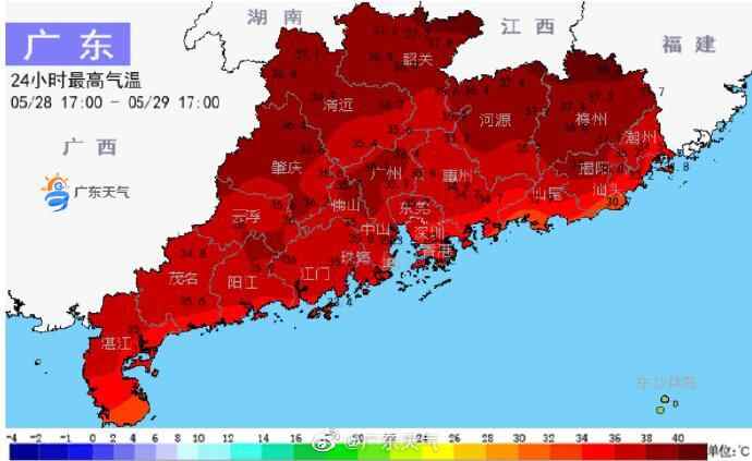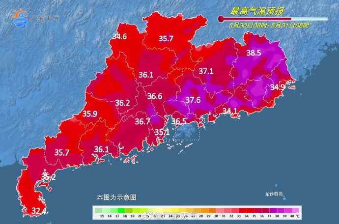 @广东天气 预计,30日广东中北部市县有大范围的35℃~37℃高温,局地可达38℃或39℃,31日至6月1日,广东省仍有35℃及以上高温,但午后雷阵雨将趋频繁,局地雨势较大,雷雨时伴有短时大风、雷电等对流性天气。