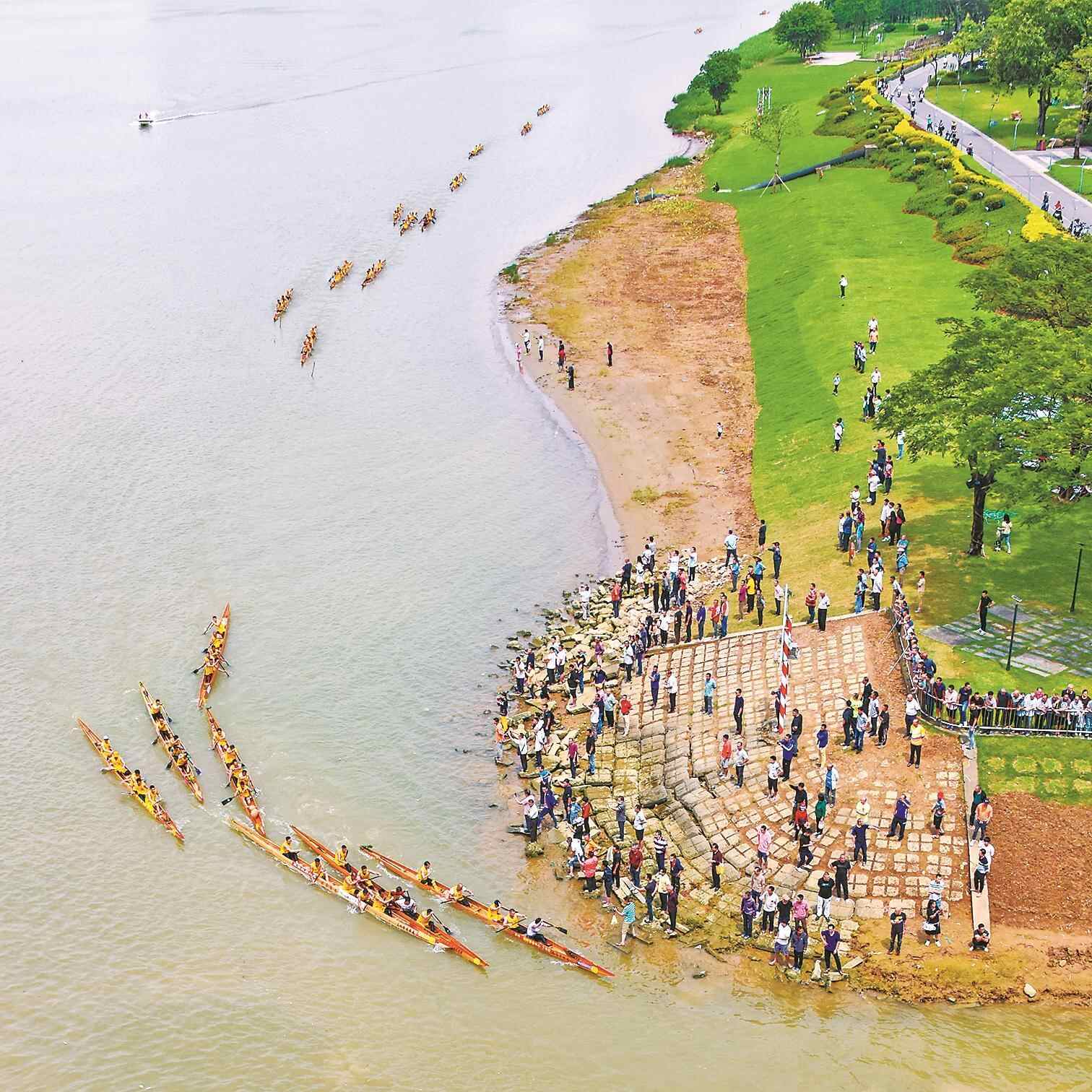 “闰月风光三月景,二分烟水八分人。”乐从龙舟每次集结都是一场盛会。鲜红的木棉花倒映在碧绿的河水上,水波浮动。河岸边的人群或坐着或蹲着,有乐事者在绿地上打上天幕坐在其中,男女老少谈笑风生。堤岸边,人头攒动,人们寻找着最佳观测点。当比赛响锣,岸边的人站起来、跳起来,堤岸上人们扒在栏杆上,齐刷刷地望向河面。