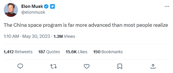 在5月29日神舟十六号载人飞行任务新闻发布会上,中国载人航天工程新闻发言人、载人航天工程办公室副主任林西强介绍了中国载人航天工程下一步的发展计划,明确表示总的目标是2030年前实现中国人首次登陆月球。对此,美国太空探索技术公司(SpaceX)首席执行官埃隆·马斯克30日表示,中国的航天工程计划比大多数人意识到的要更加超前。